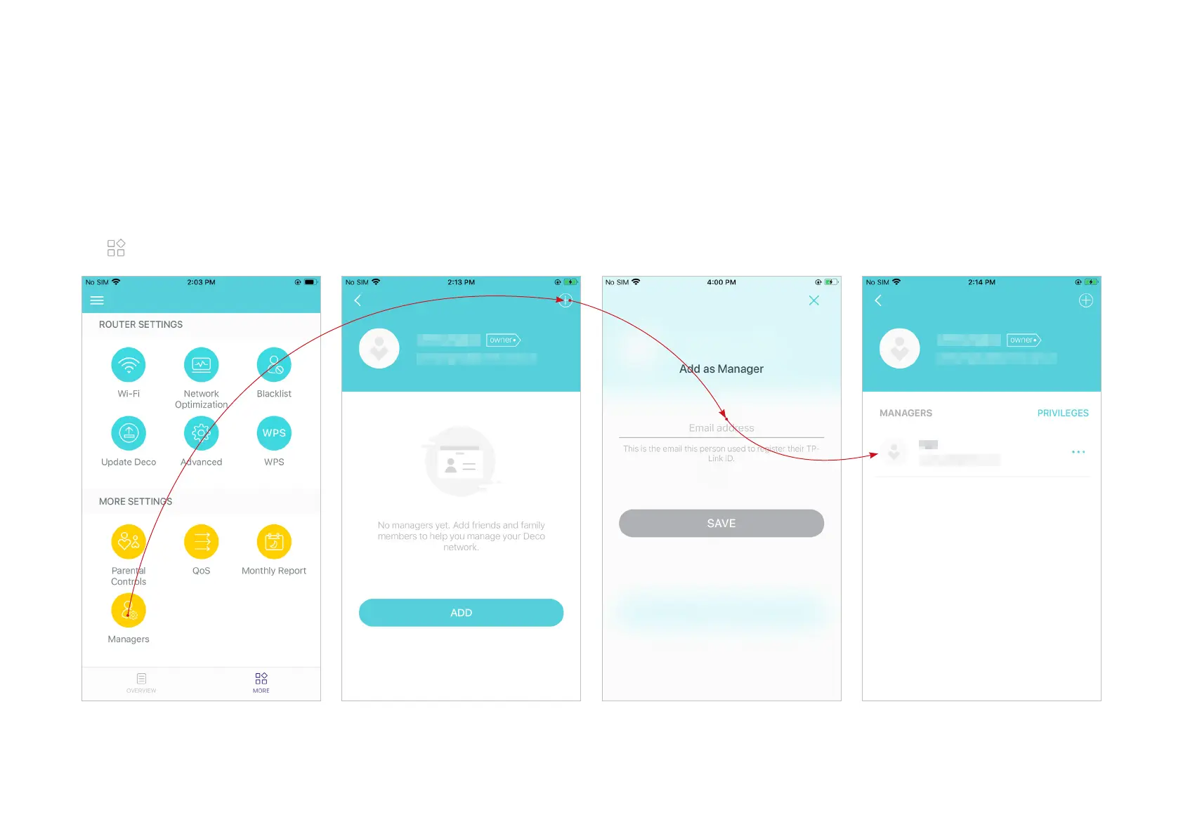 Tap > Managers, and follow app instructions to add other TP-Link ID account as manager. Then the manager can start to manage the network.