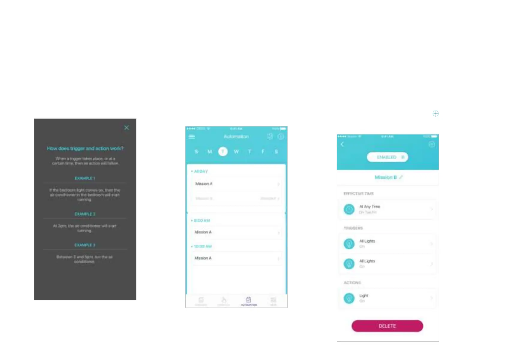 Automation allows you to set interactions between your smart devices. For example, if the bedroom light comes on (which is a trigger), then the air