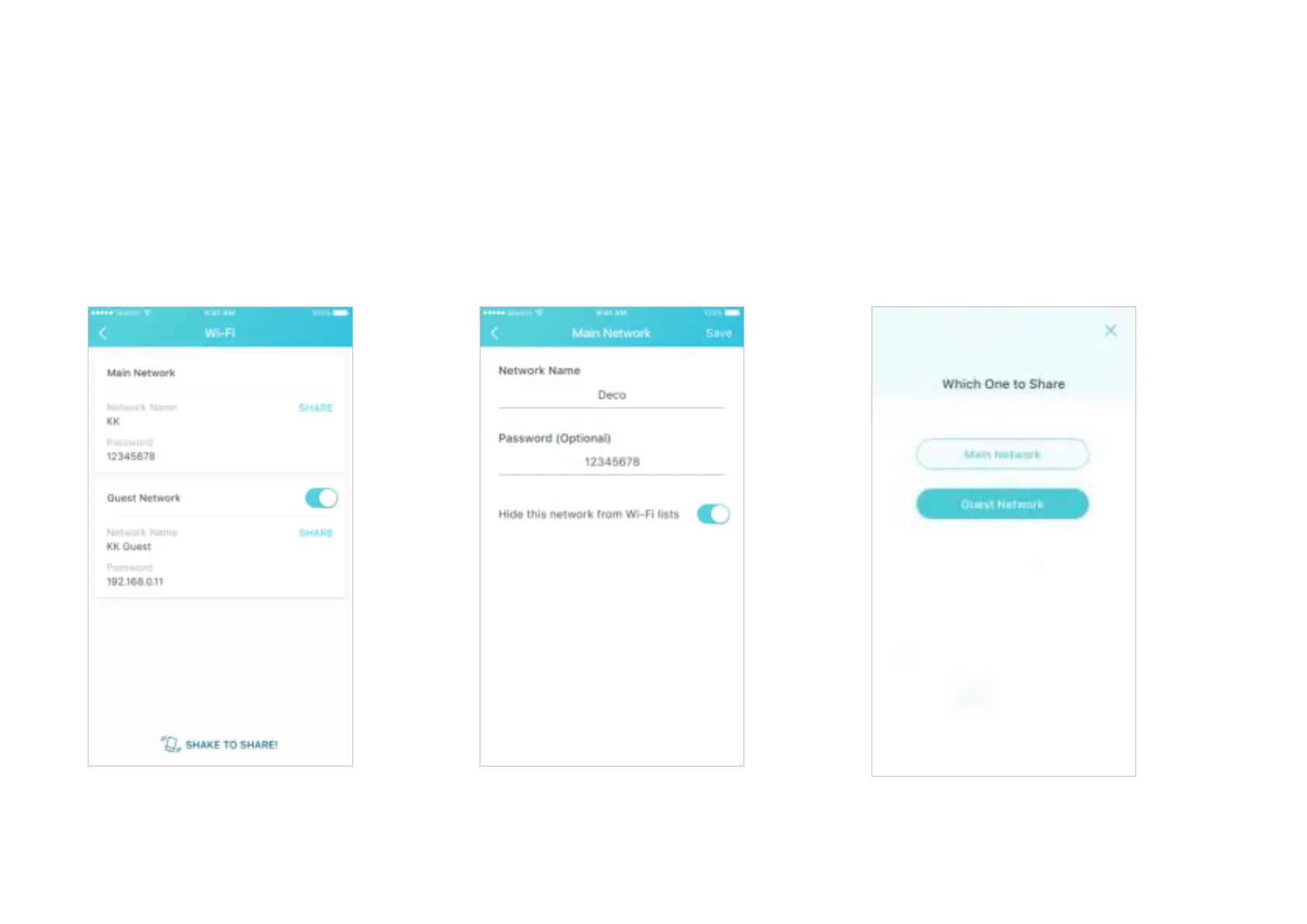 an easy-to-remember password. You can shake your device to share the network details easily with family and friends.