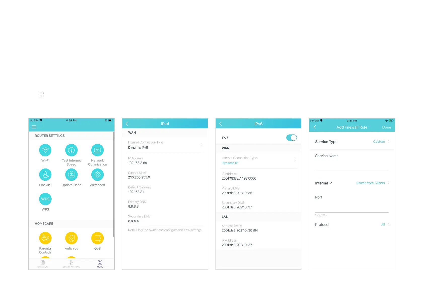 Additional features are available under the Advanced menu. You can modify WAN settings (IPv4 & IPv6), add IPv6 rewall rules, modify LAN IP, set up