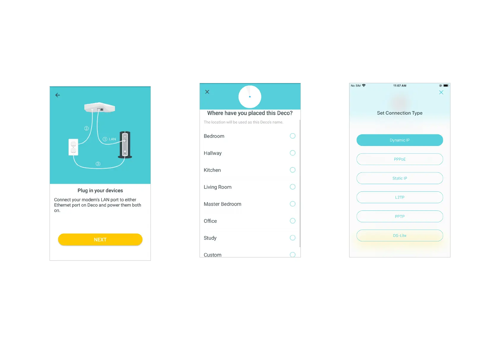 TP-Link Deco M9 Plus - Connect Modem to Deco Unit; Select Deco Location; Configure Internet Connection