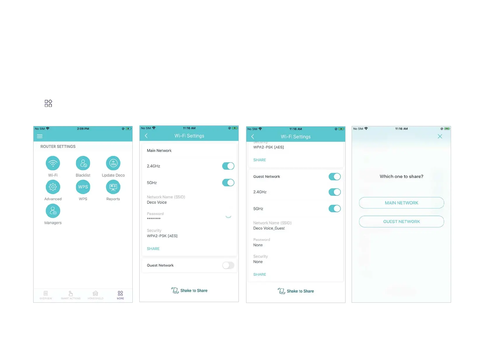 Tap > Wi-Fi Enable guest network Shake to share your network