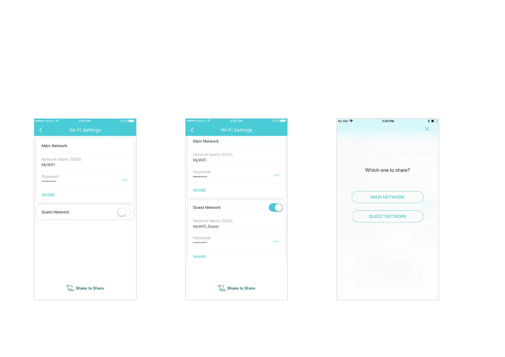 You can change the network name and password of your main network, create a separate network for guests, and shake your device to share the