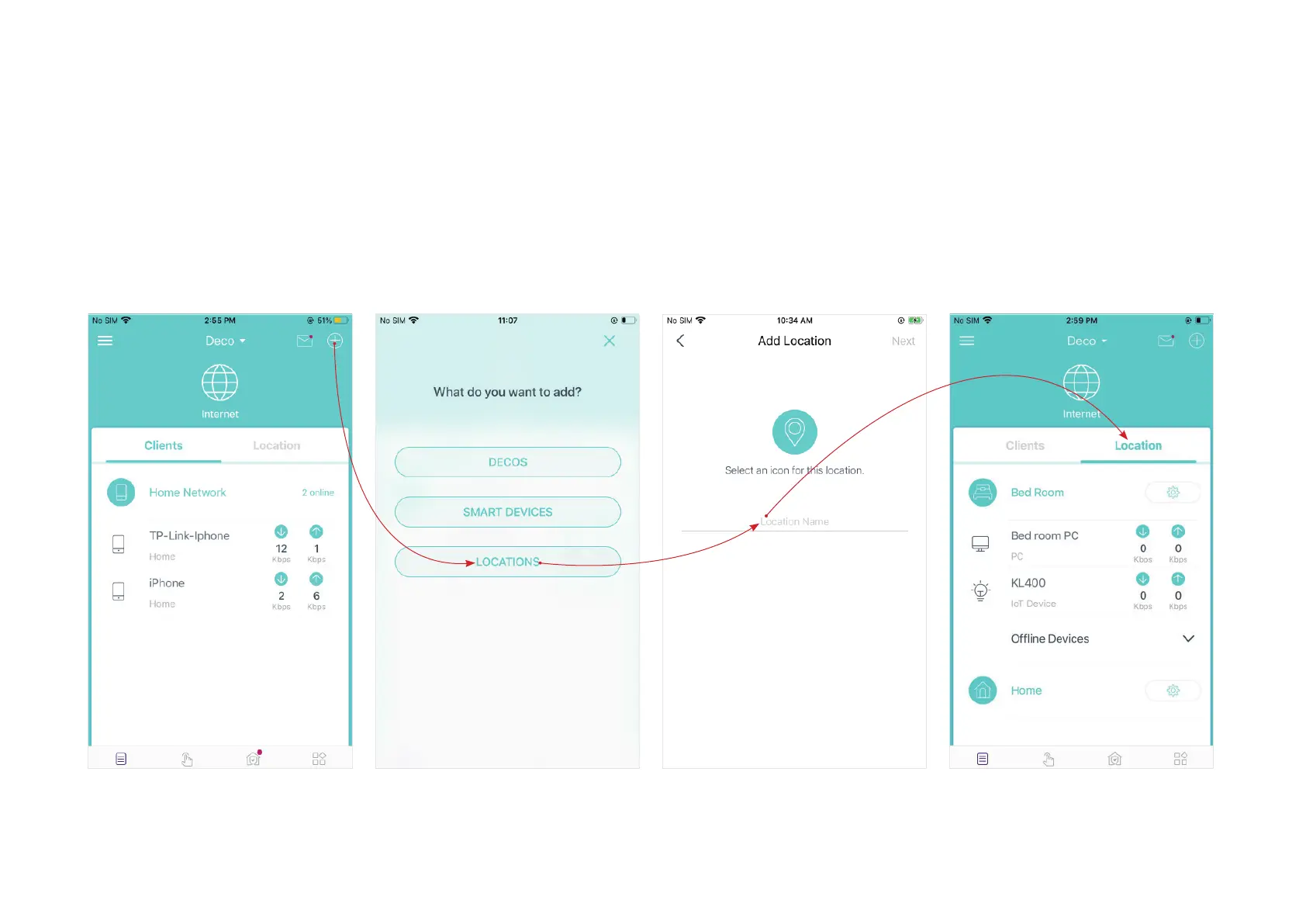 After adding your devices to the Deco network, you can sort them by customized locations so that it will be more convenient and ecient to manage