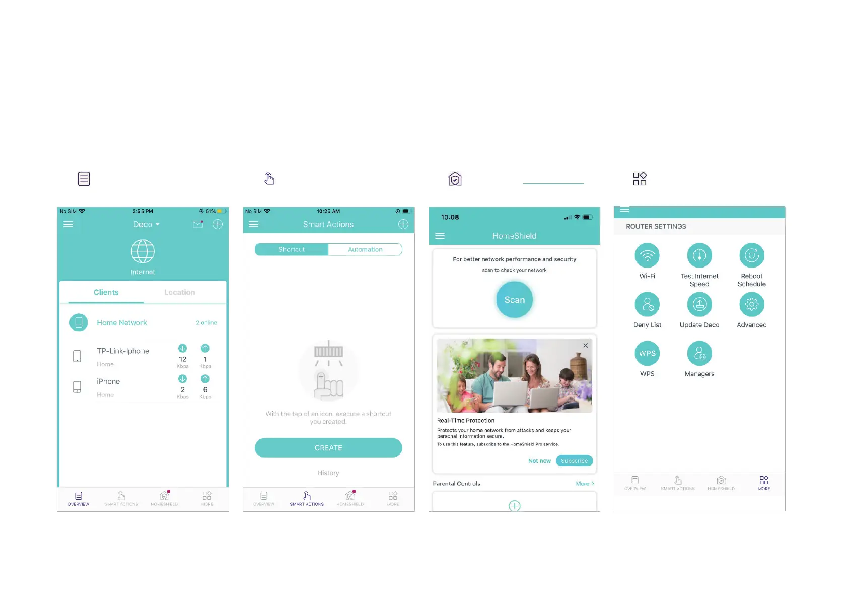 TP-Link Deco W3600 - Dashboard; Network Overview; Smart Actions and Automation; HomeShield Features