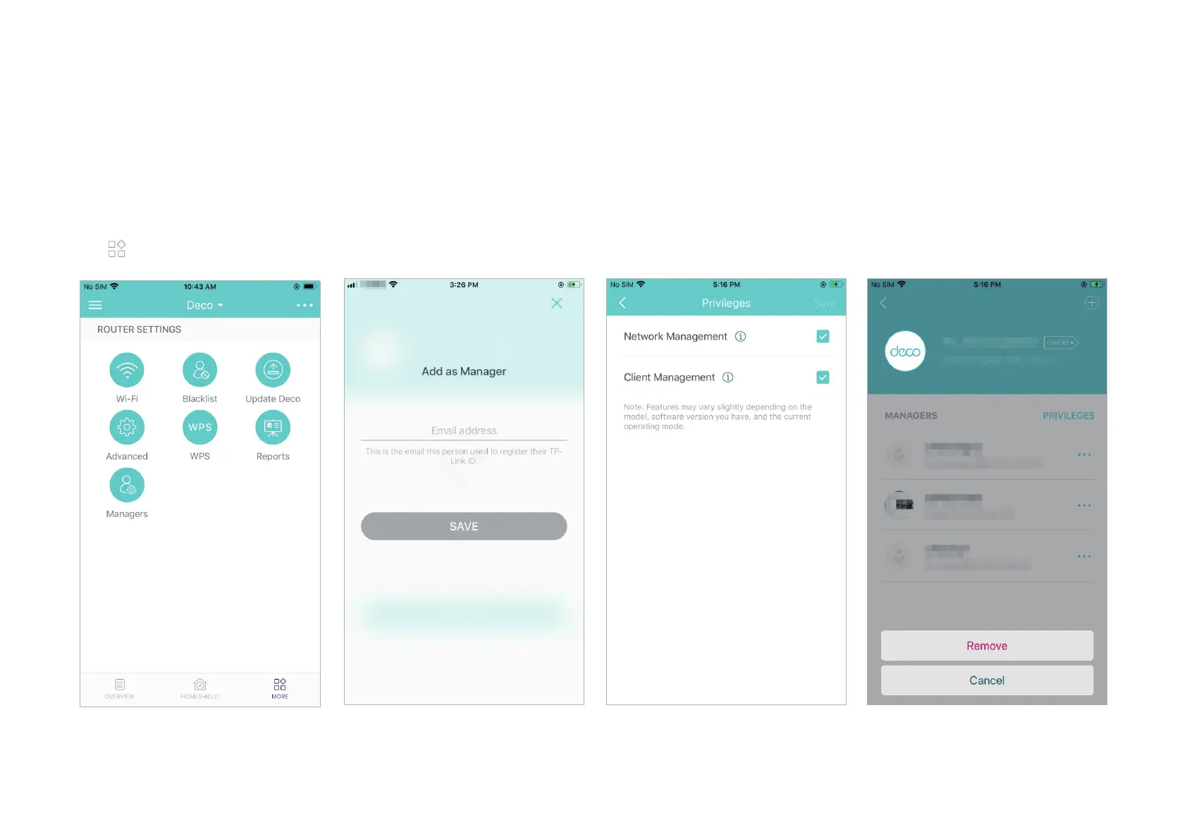 TP-Link deco W7200 - Managers; Add Other Accounts as Managers; Set Privileges for Managers; Remove Managers