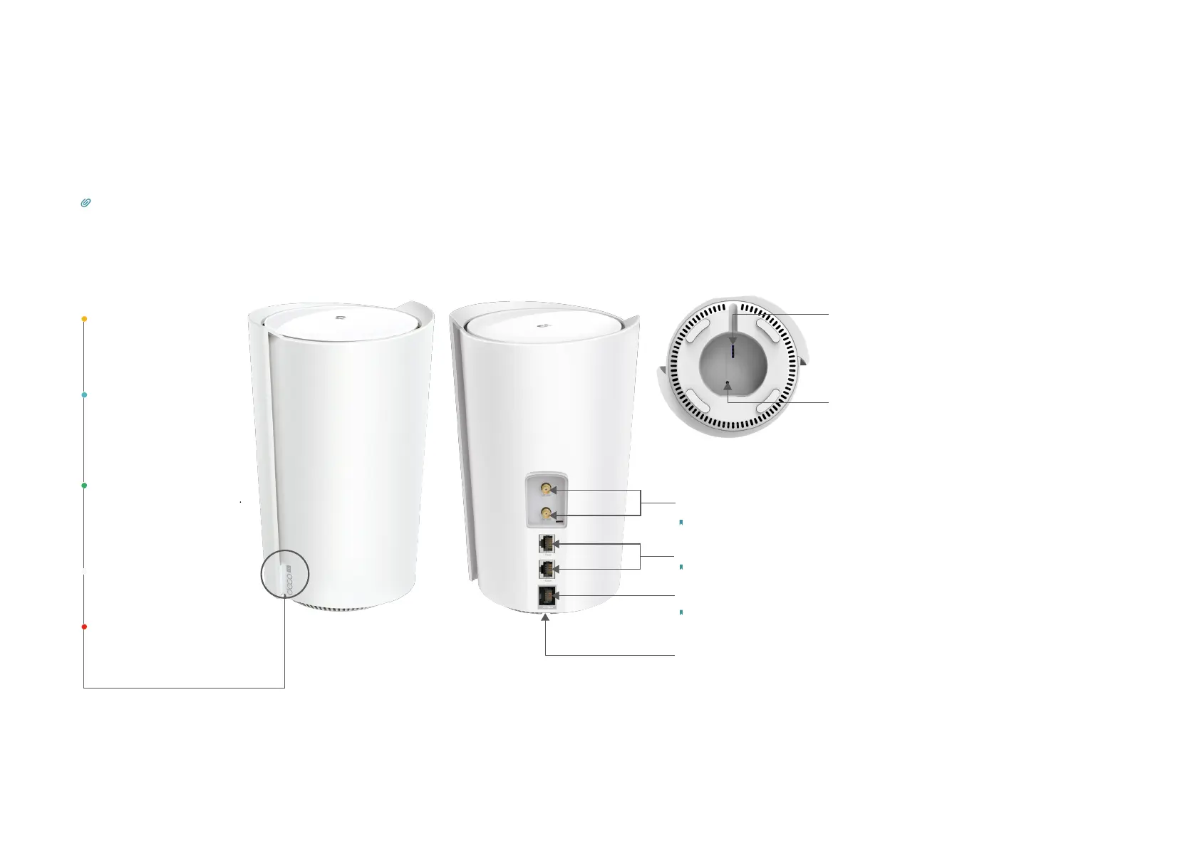 Each Deco has an LED that changes color according to its status, three RJ-45 Ethernet ports, two external antenna ports, a SIM card slot, a power slot,