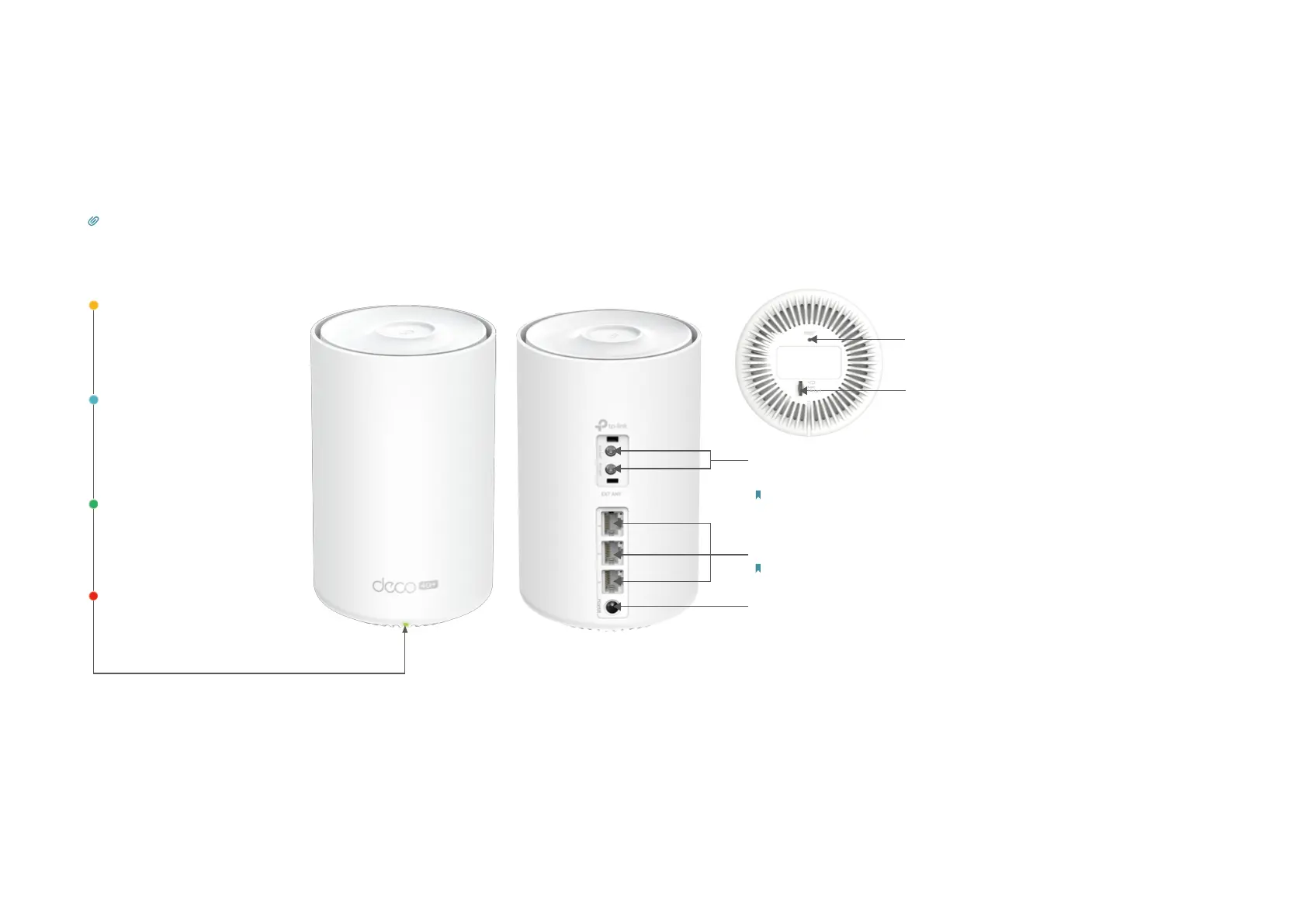 Each Deco has an LED that changes color according to its status, three RJ-45 Ethernet ports, two external antennas port, a SIM card slot, a power slot,