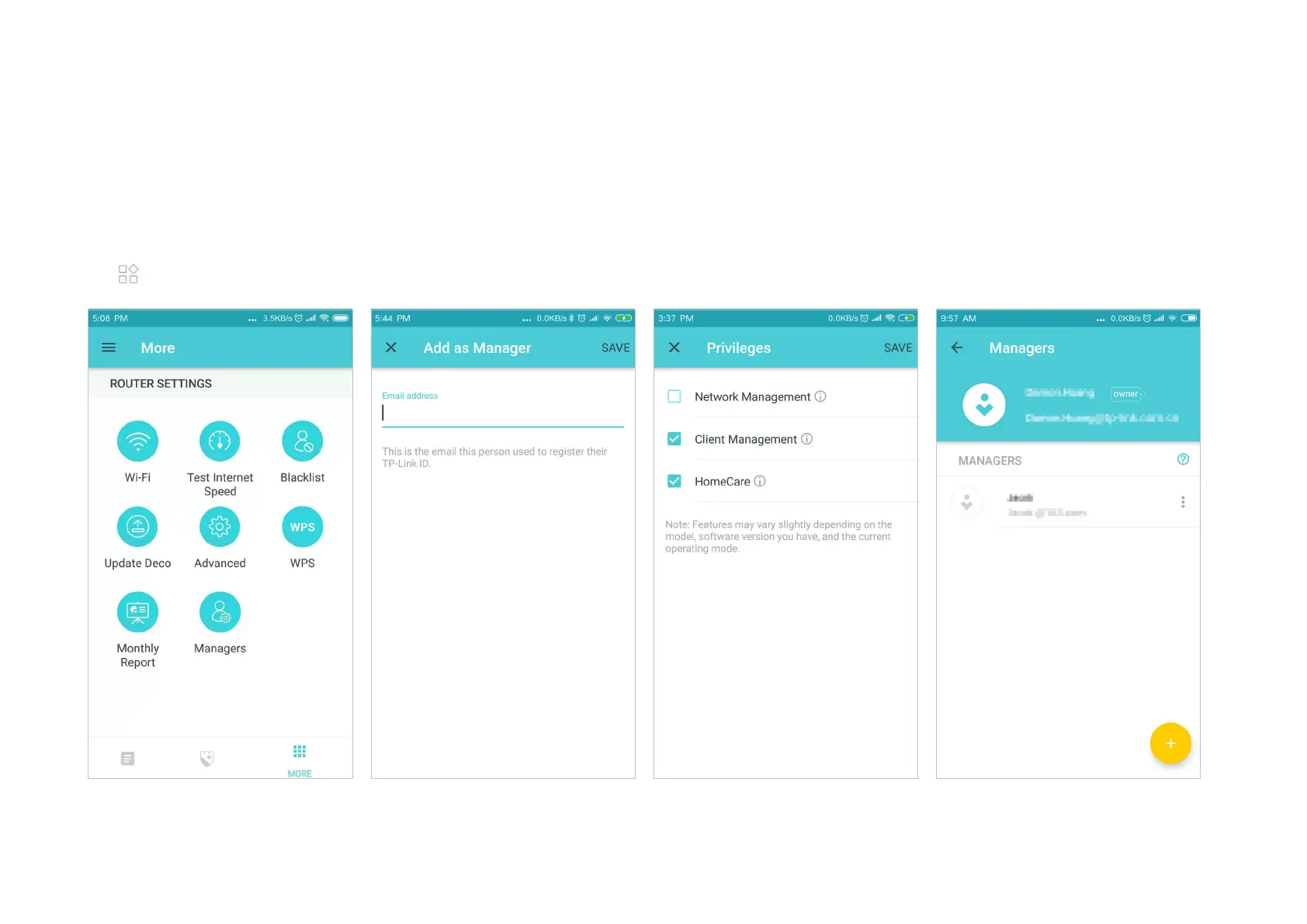 TP-Link Deco X60 - Network Managers; Add Network Managers; Assign Manager Privileges; Manage Manager List