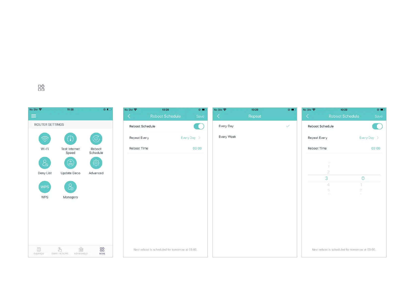 Toggle on Reboot Schedule. Set how often and when your Deco reboots. Then the next reboot is scheduled at