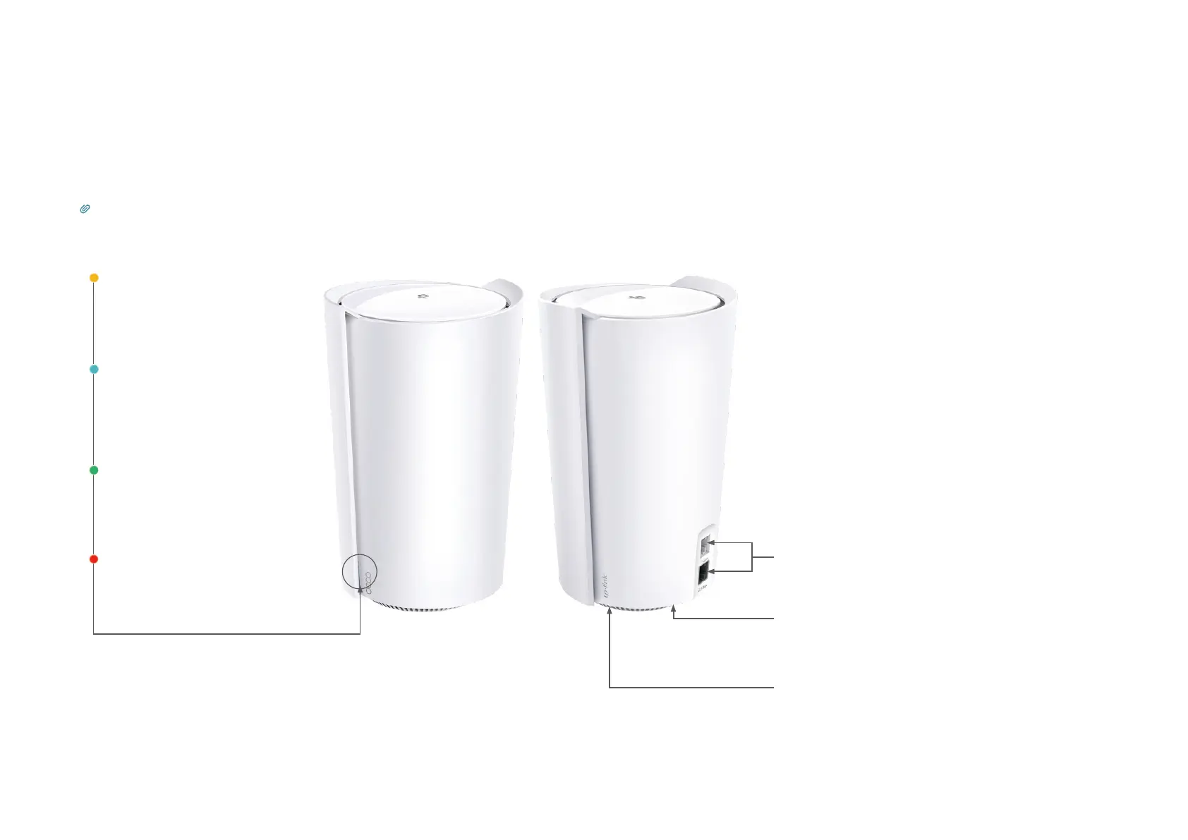 Each Deco has an LED that changes color according to its status, two RJ-45 Ethernet ports, a power slot, and a Reset button.