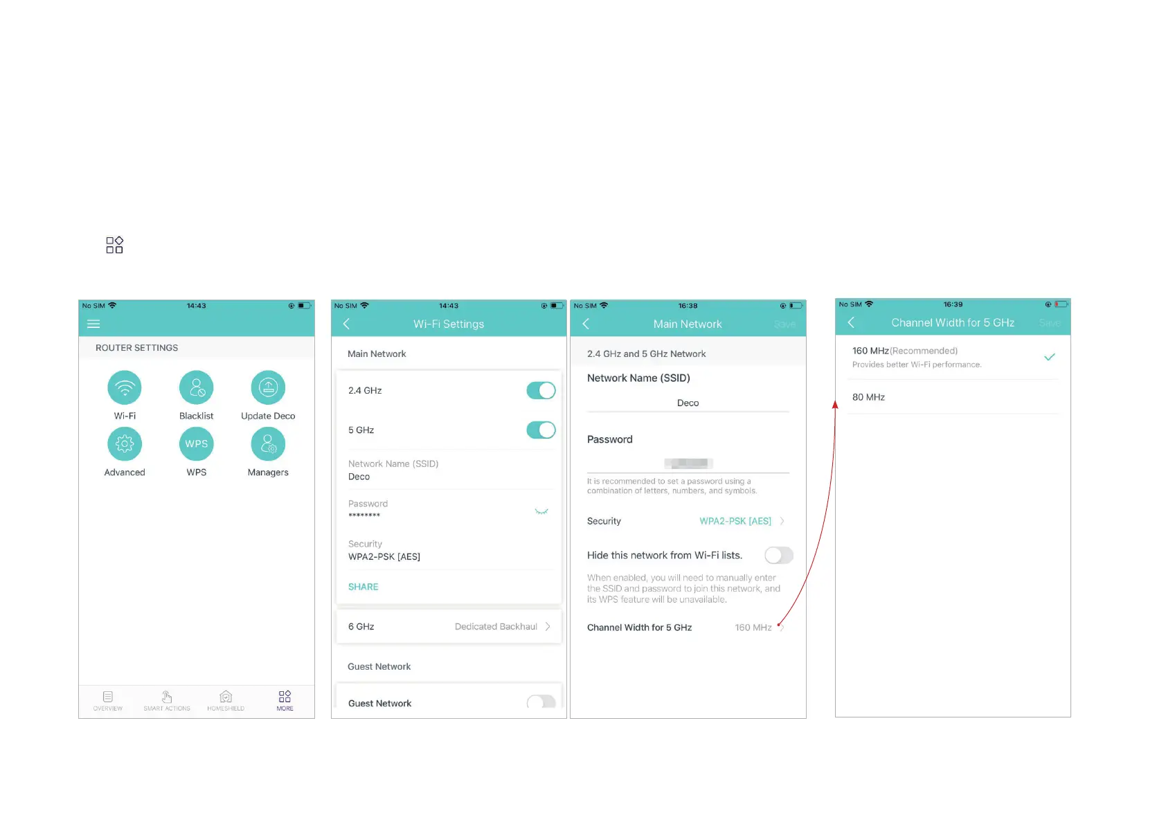 Tap > Wi-Fi. Set a channel width for 5GHz Wi-Fi. 160MHz