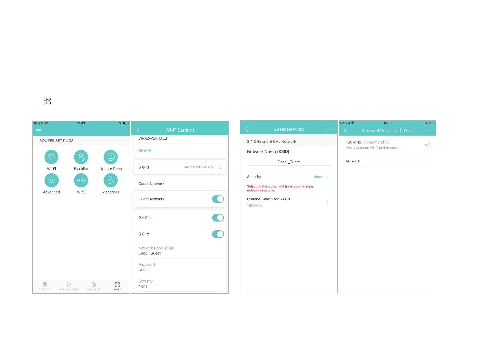 network from Wi-Fi list, set channel width for 5GHz Wi-Fi. etc.).