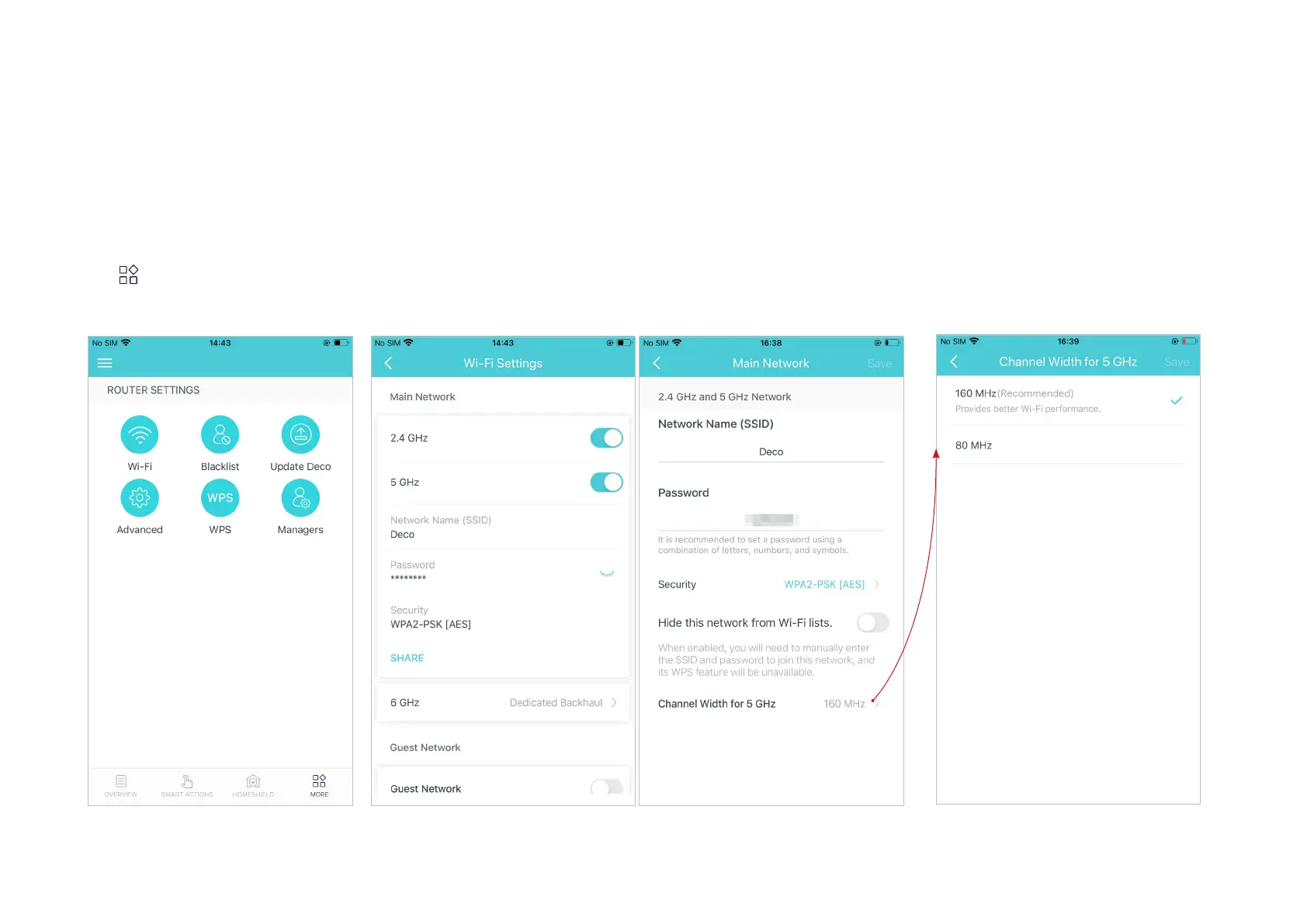 Tap > Wi-Fi. Set a channel width for 5GHz Wi-Fi. 160MHz
