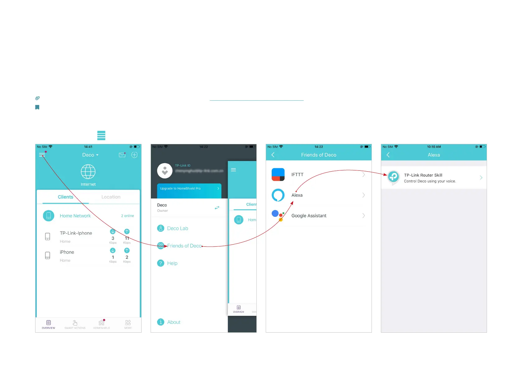 In the Deco app, tap to open the menu, tap Friends of Deco > Alexa > TP-Link Router Skill, then follow the app instructions complete the setup.