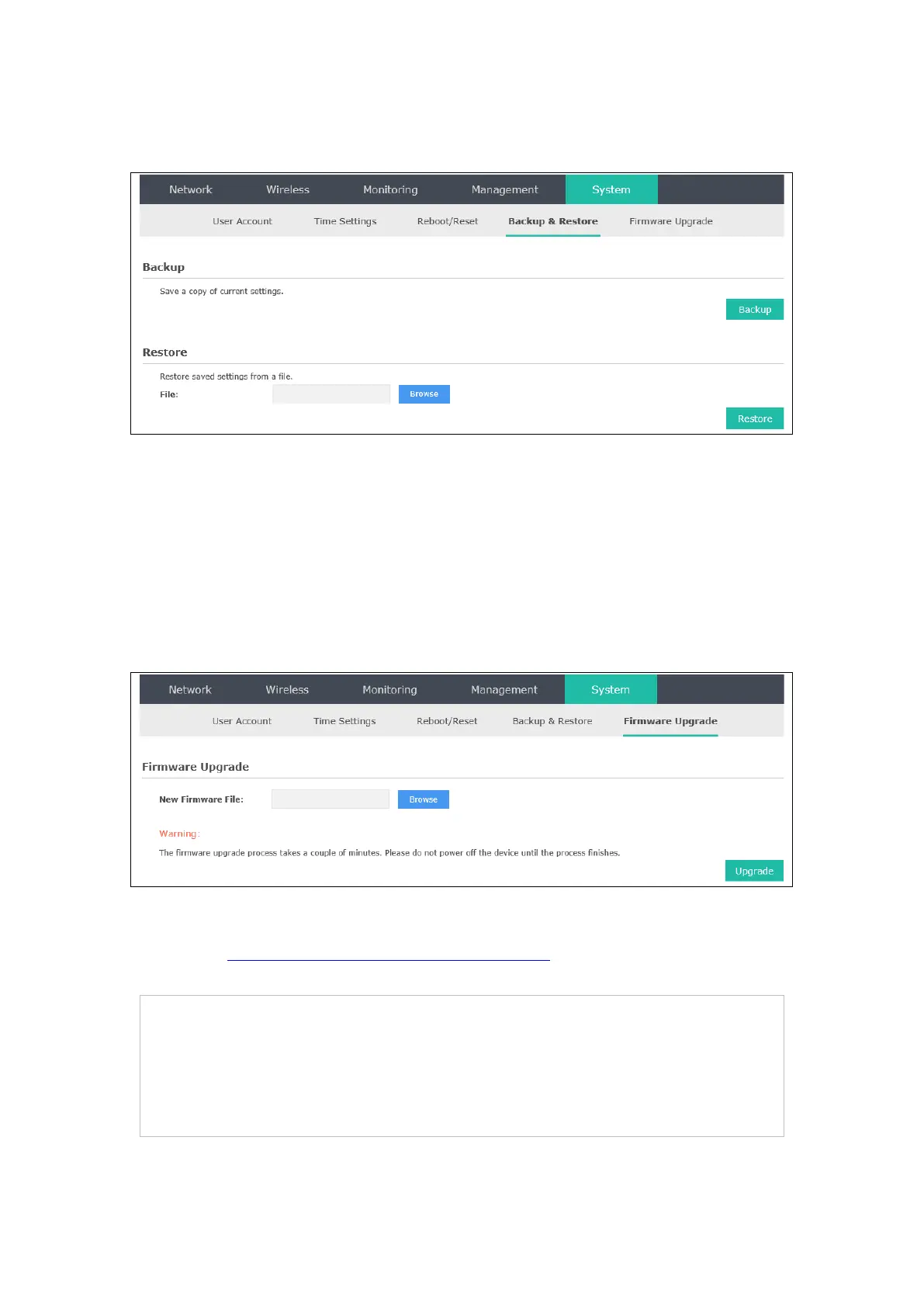 Restore function helps you to restore the device to previous settings by uploading a backup file.