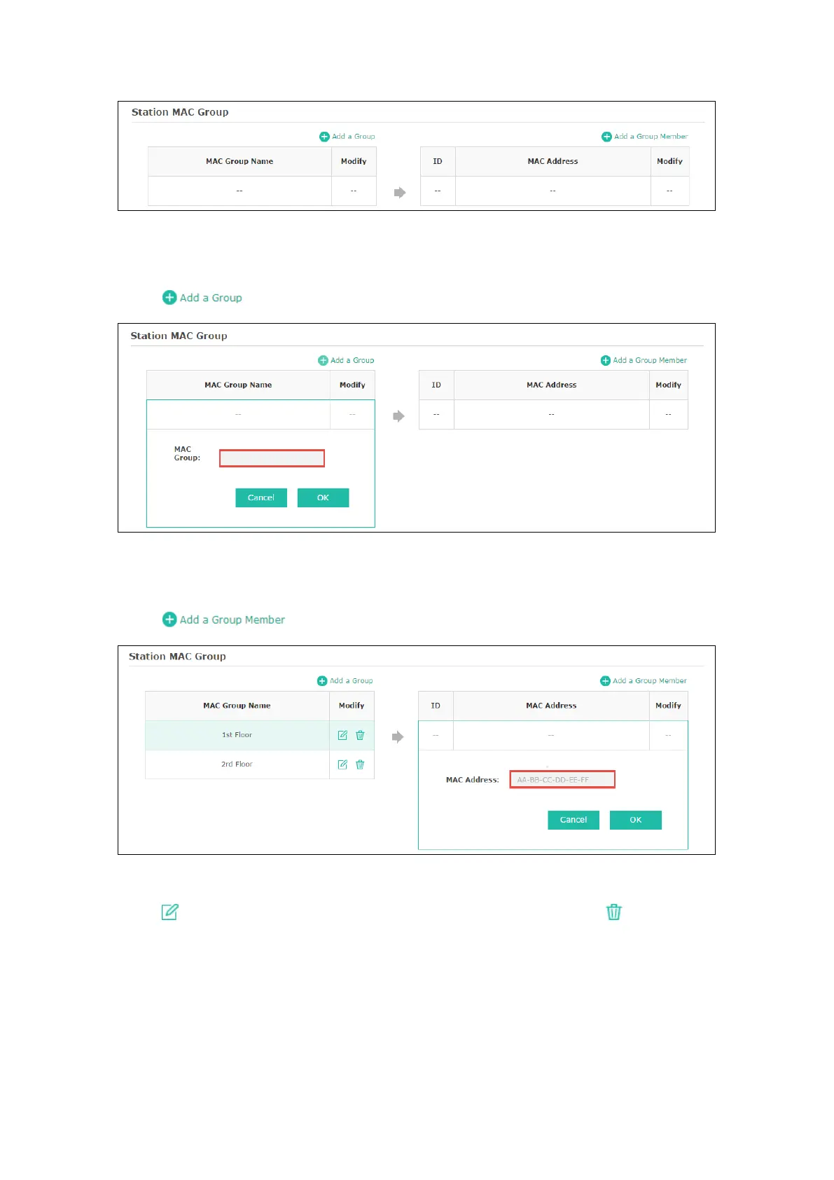 Click in Modify column to edit the MAC group name or MAC address. Click to delete the