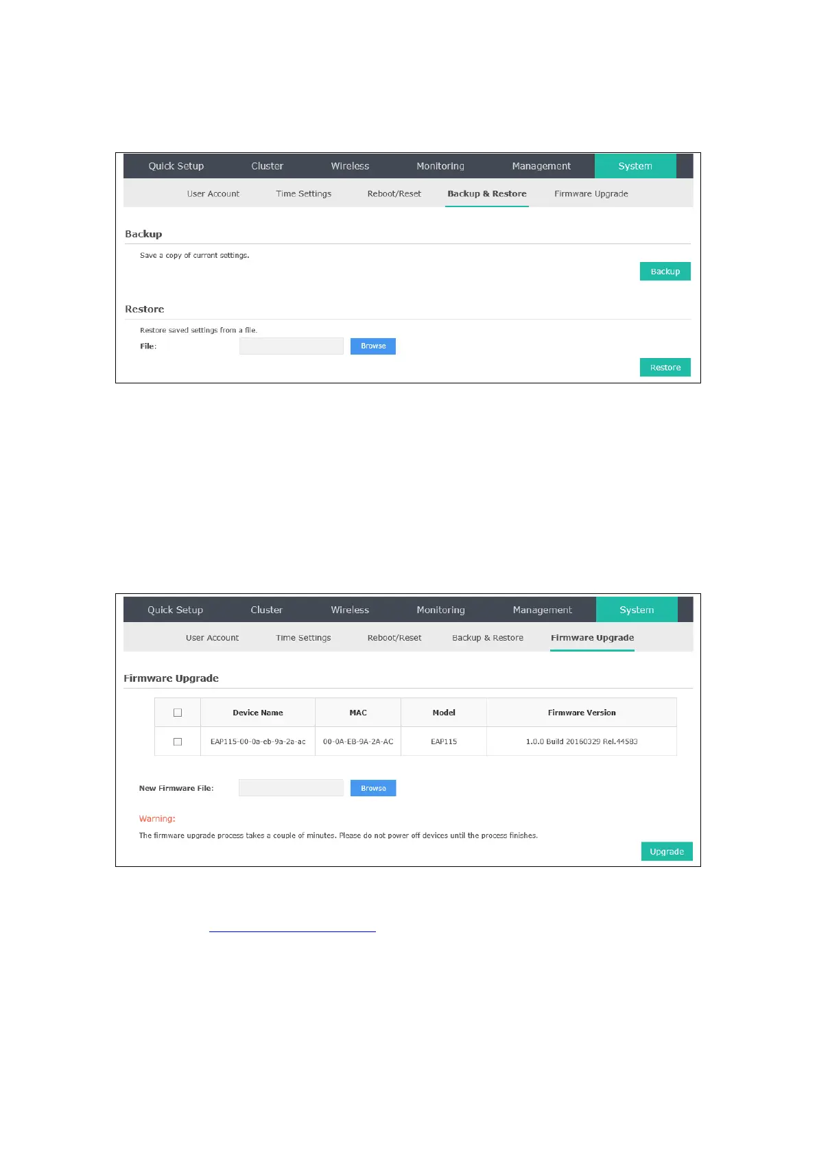 choose the firmware file. Finally click Upgrade to upgrade the devices.
