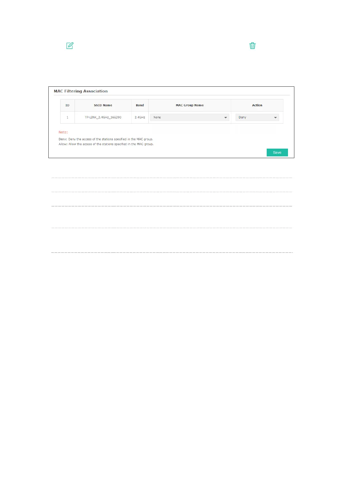 Click in Modify column to edit the MAC group name or MAC address. Click to delete the