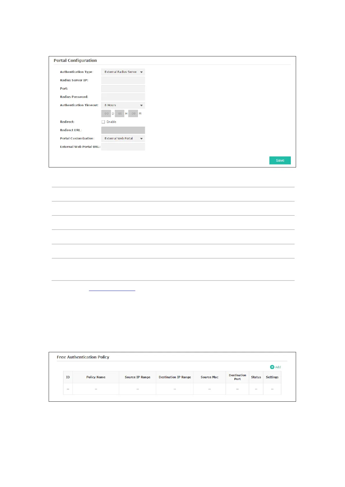 of the Portal page you can configure and view free authentication policies.