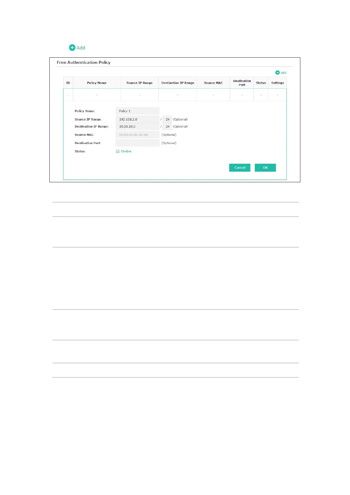 Enter the destination IP address and subnet mask for free authentication policy.