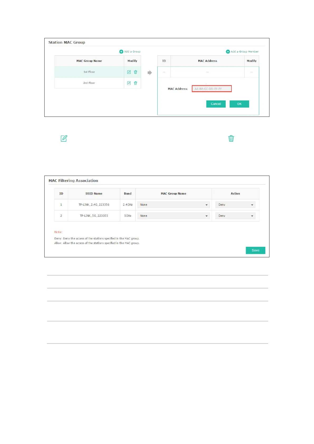 Click in Modify column to edit the MAC group name or MAC address. Click to delete the
