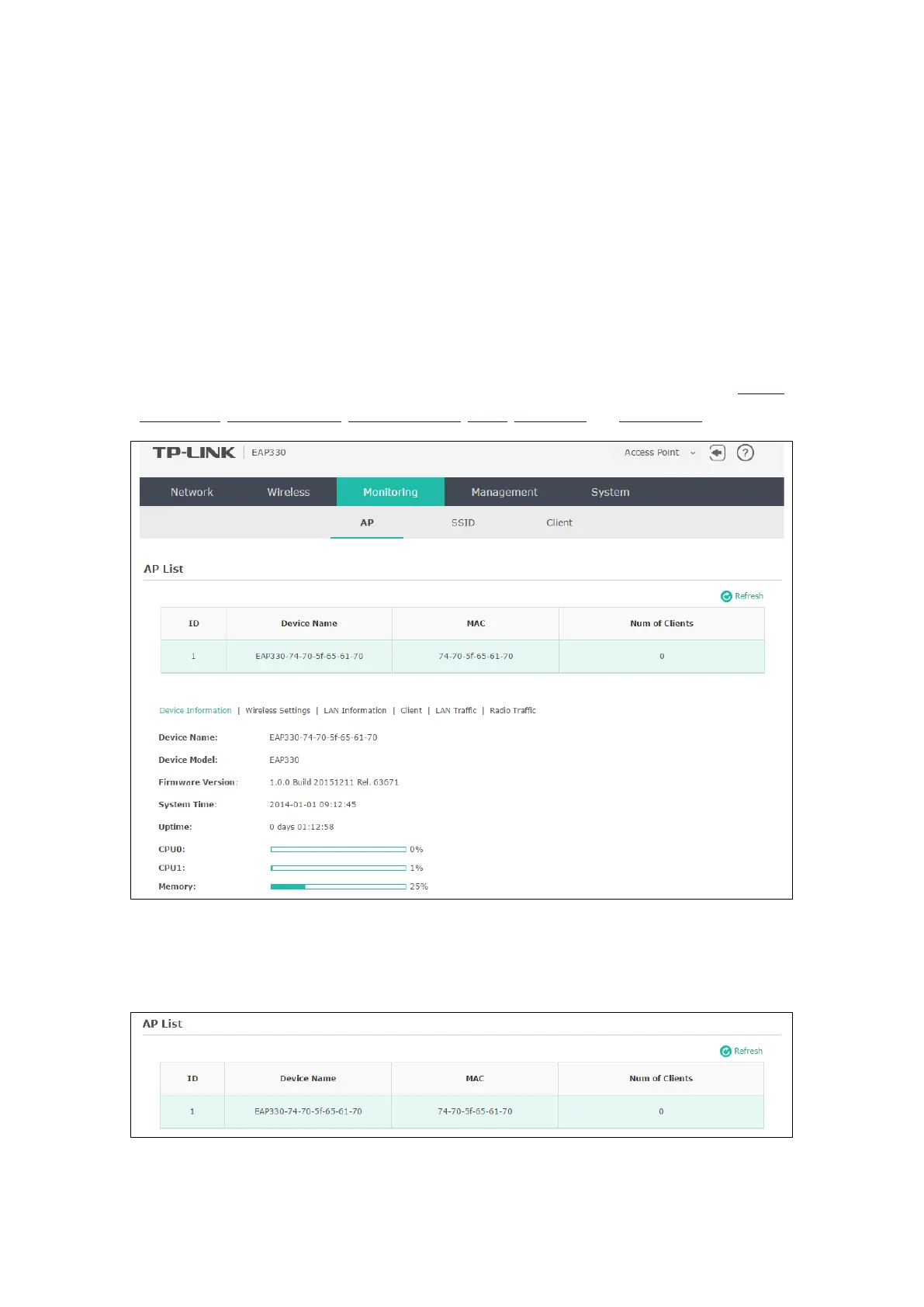 AP List on the Monitoring page displays the device name, its MAC address and the number of