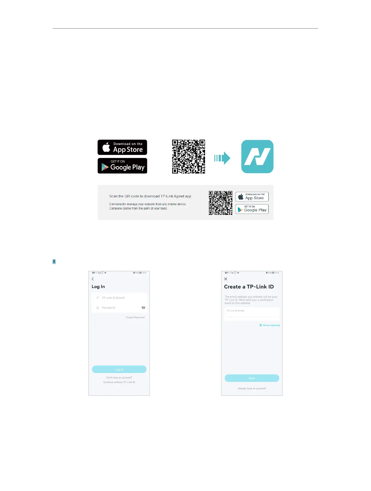 Open the Aginet app. Use your TP-Link ID to log in. If you don’t have a TP-Link ID, tap