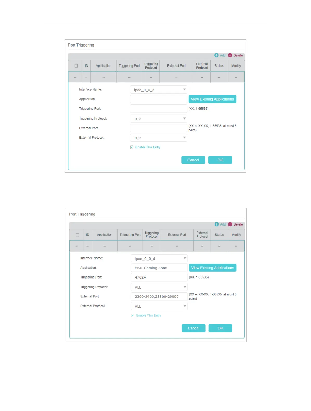Port, Triggering Protocol and External Port will be automatically filled in. The following