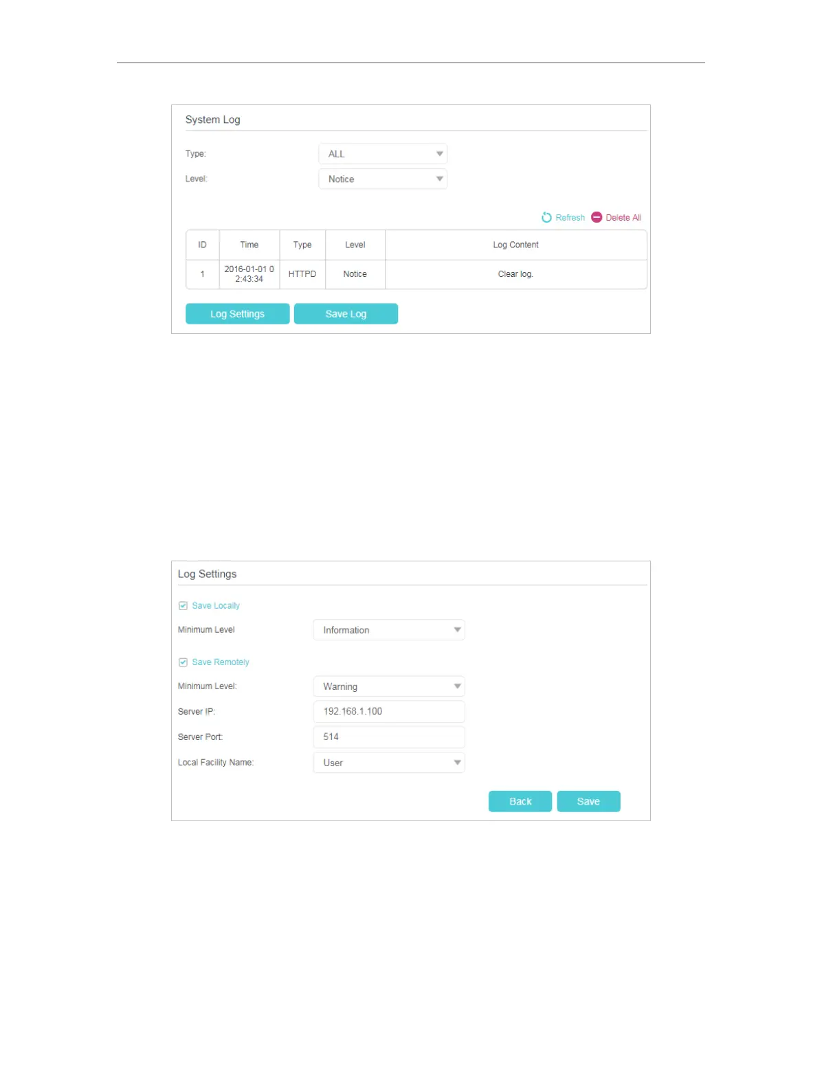 • Save Locally: Select this option to cache the system log to the router’s local memory,
