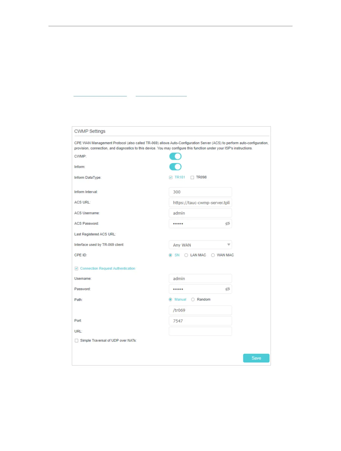 • CWMP: Enable or disable the CWMP (CPE WAN Management Protocol) function.