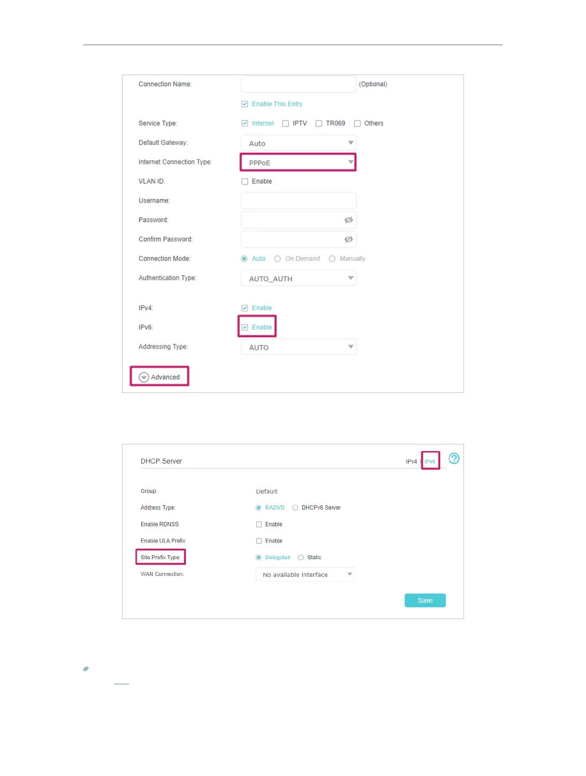 5. Configure LAN ports. Go to Advanced > Network > LAN Settings. Fill in Site Prefix