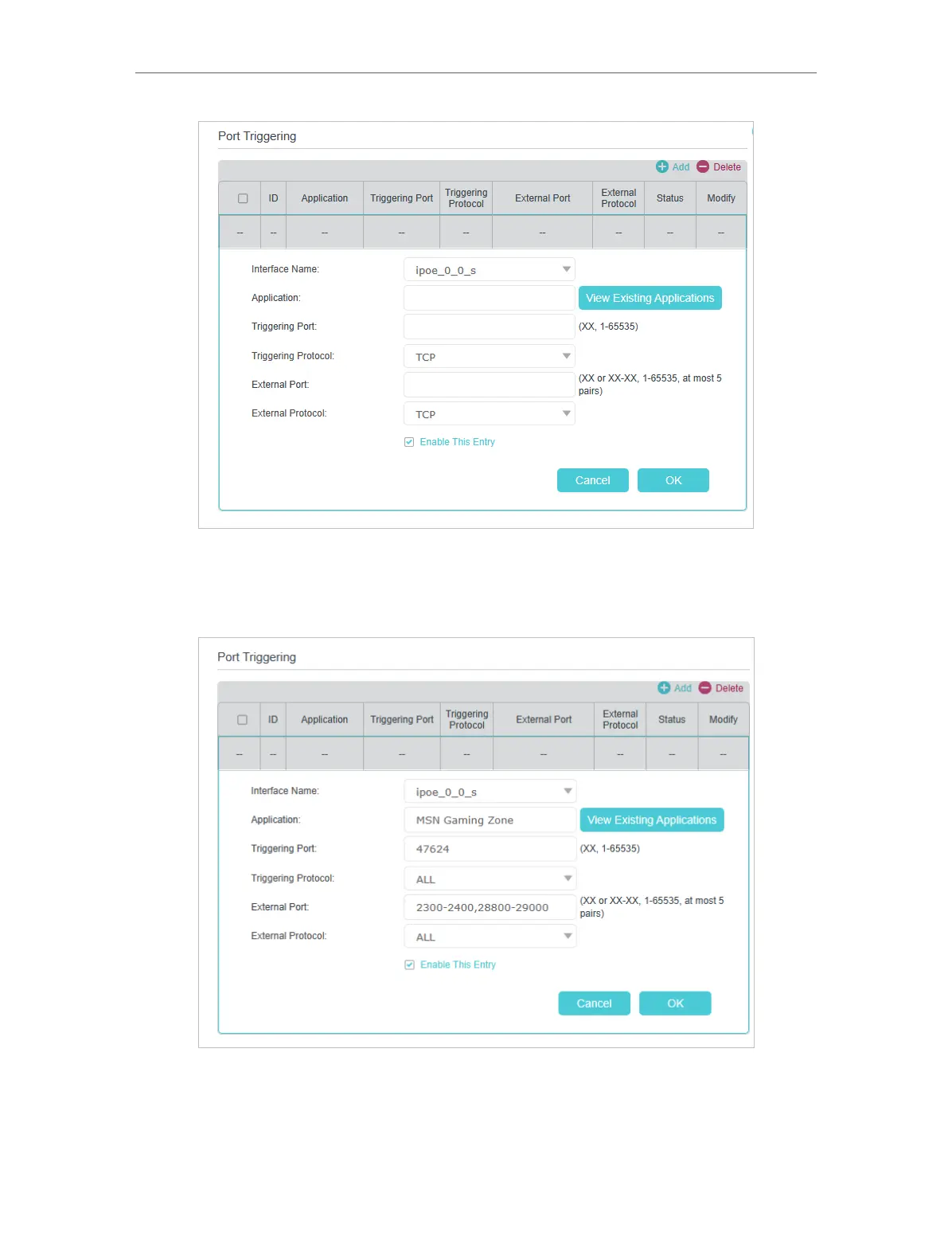 Port, Triggering Protocol and External Port will be automatically filled in. The following