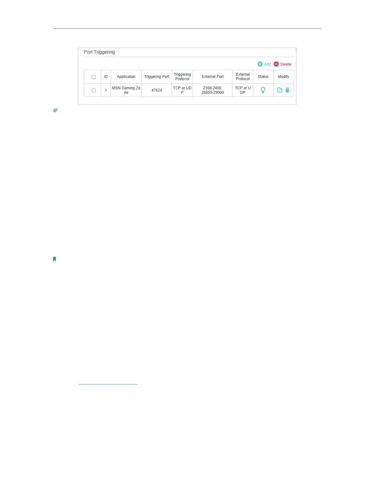 • You can add multiple port triggering rules according to your network need.