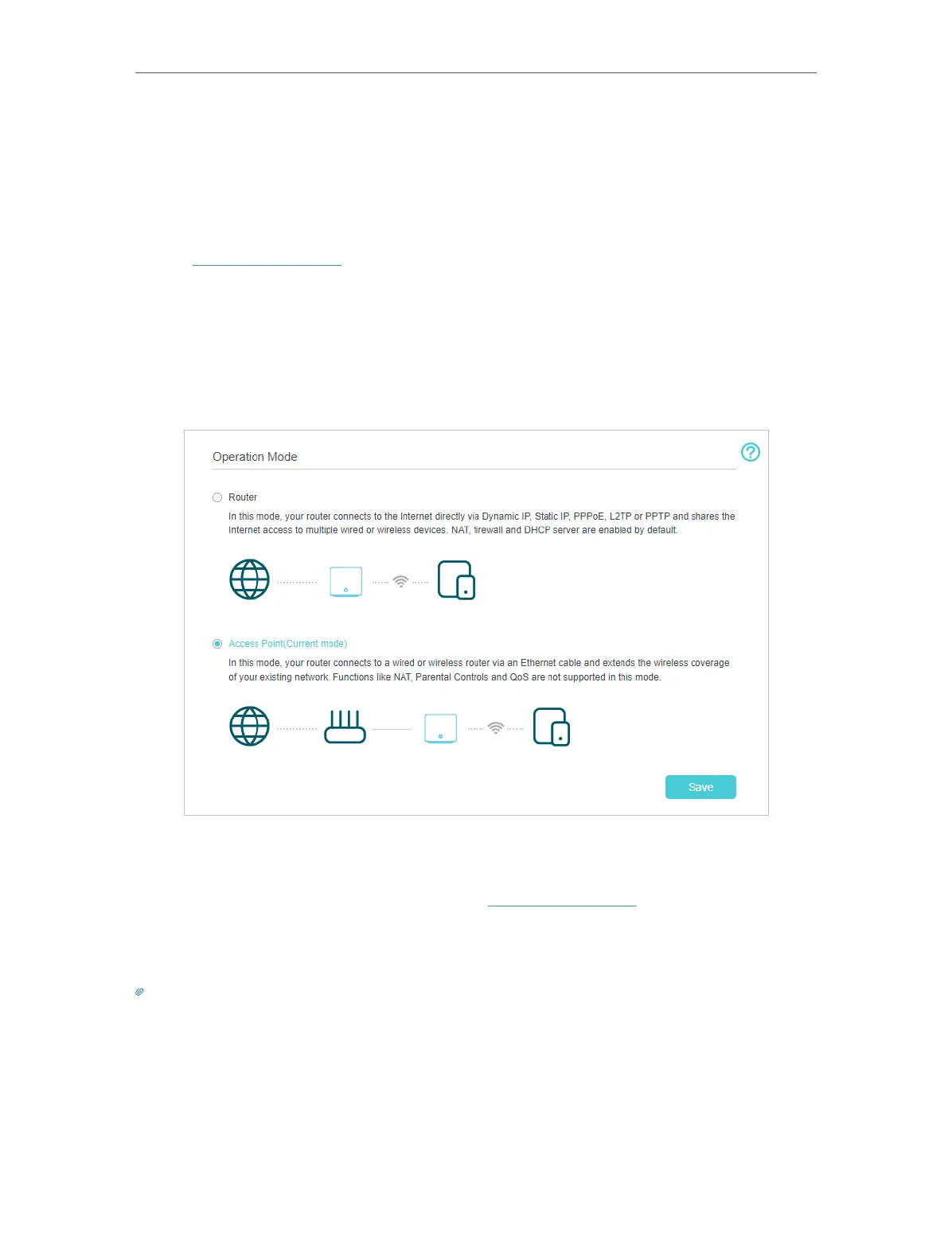 • Functions, such as Parental Controls, QoS and NAT Forwarding, are supported in the Router mode.