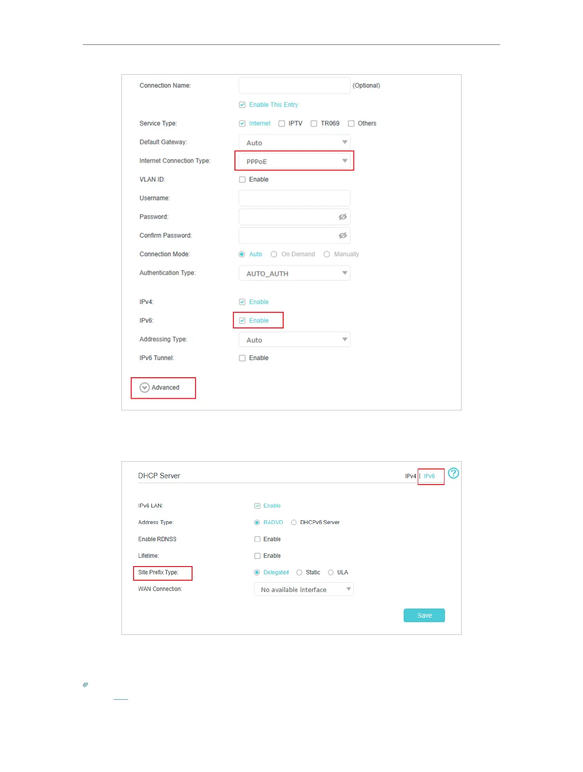5. Configure LAN ports. Go to Advanced > Network > LAN Settings. Fill in Site Prefix