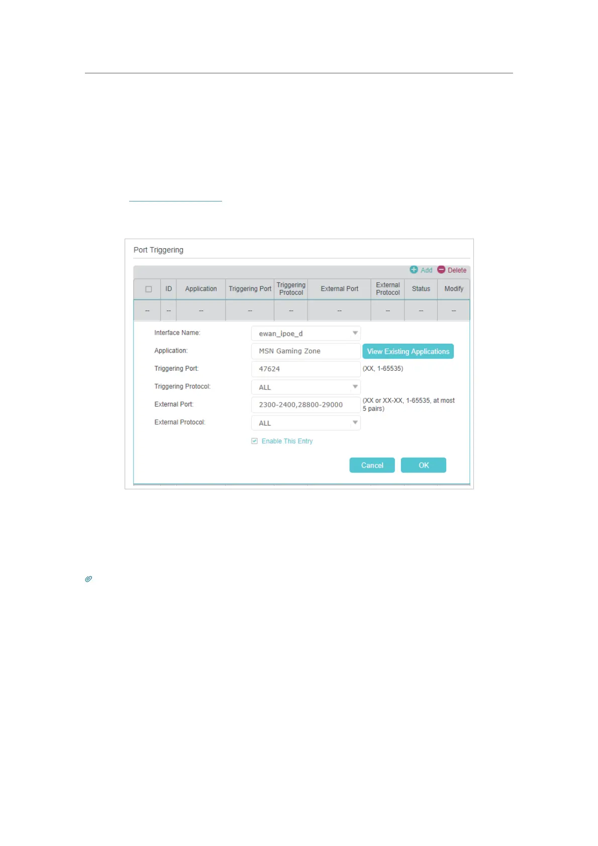 2. Go to Settings > NAT Forwarding > Port Triggering and click Add.