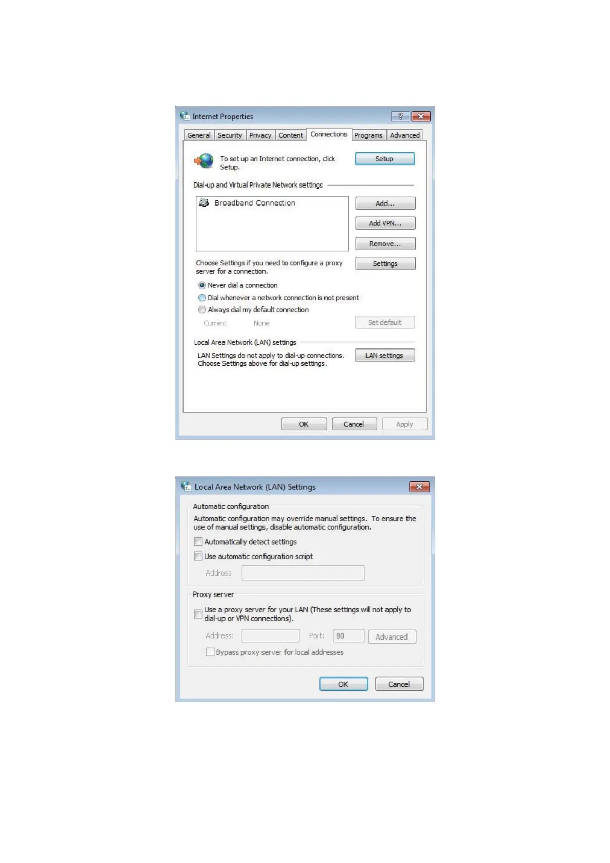 4 ) Click LAN settings and clear the following three options and click OK.