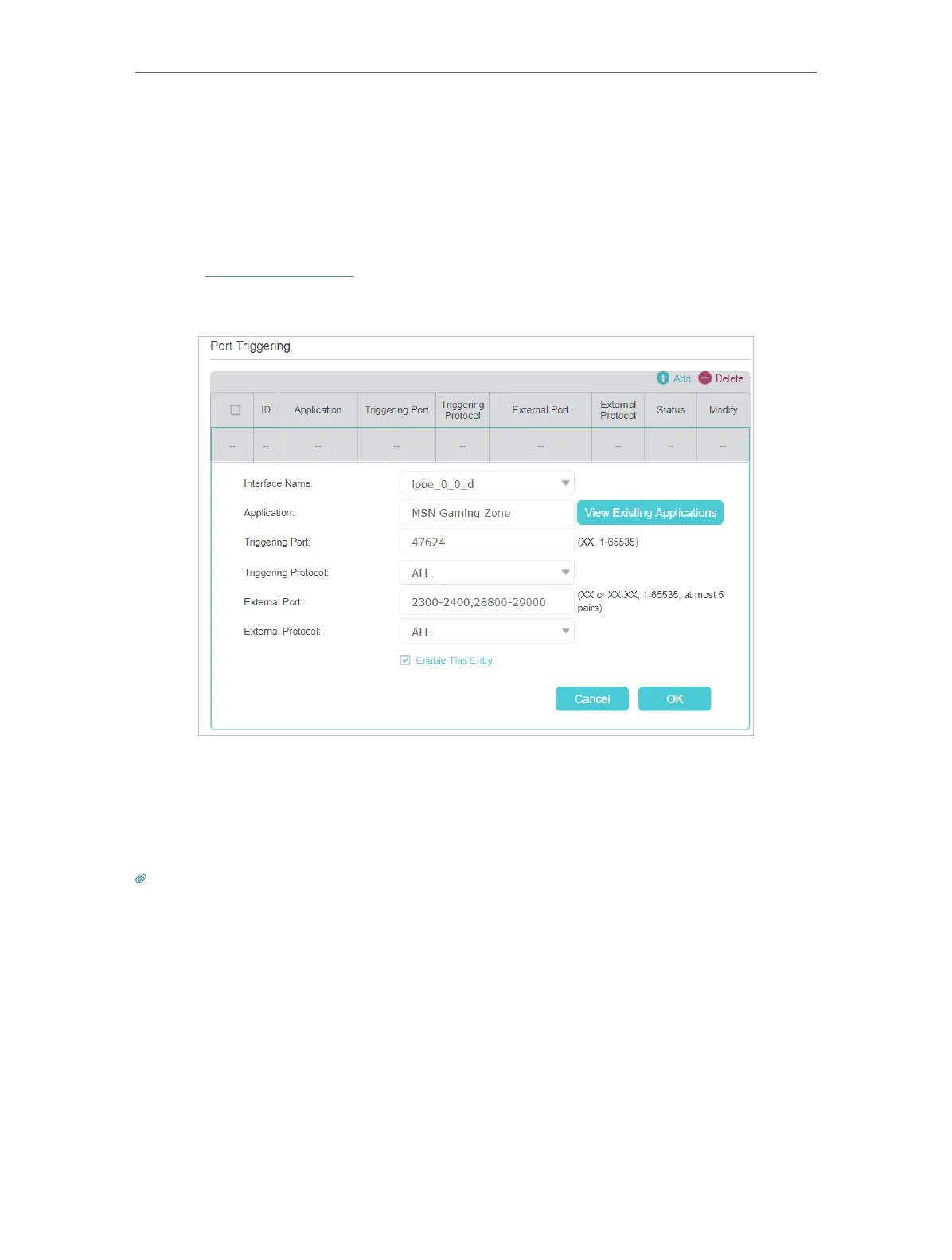 Follow the steps below to configure the port triggering rules: