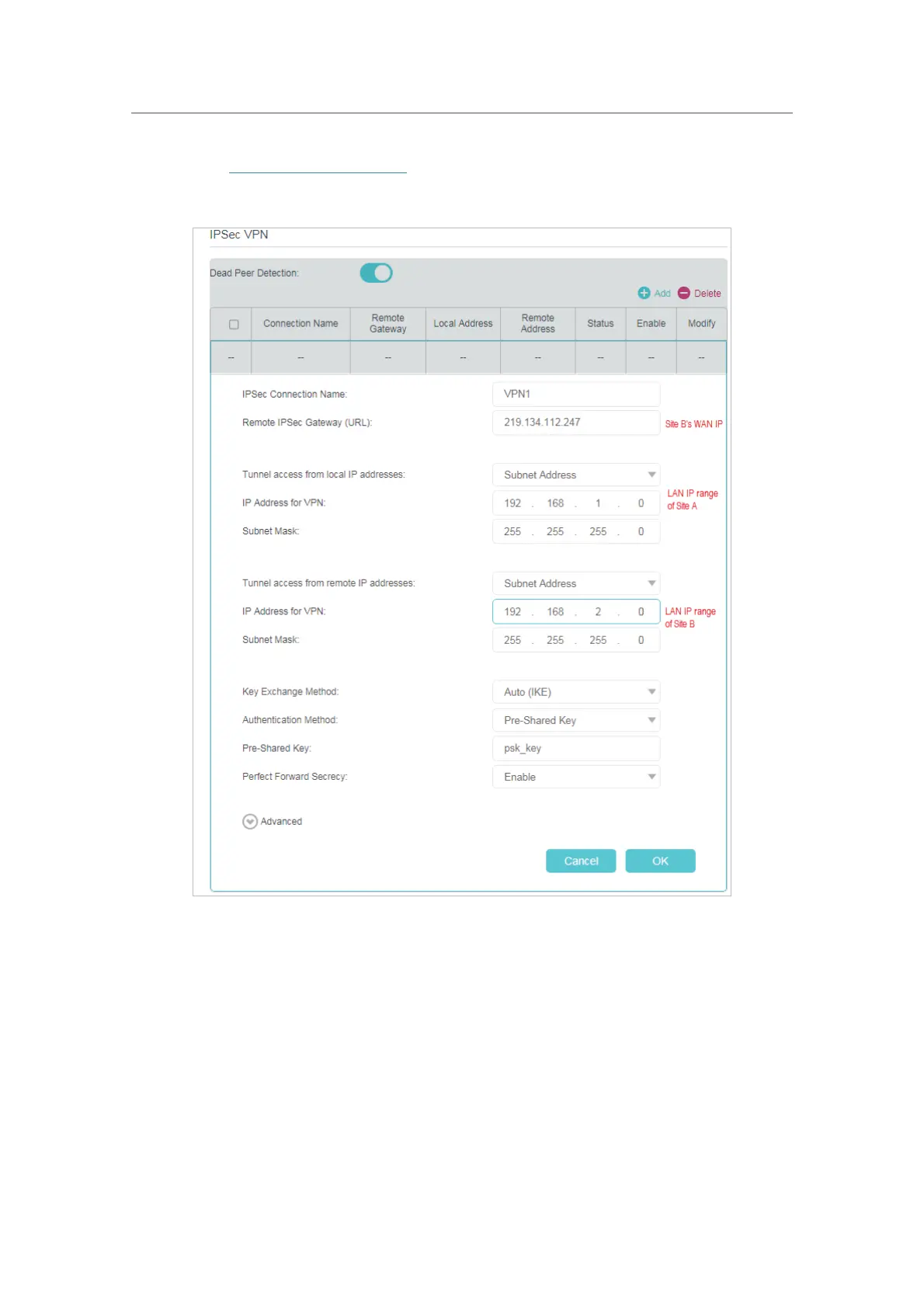 as an example. Input the LAN IP range of Site B in the IP Address for