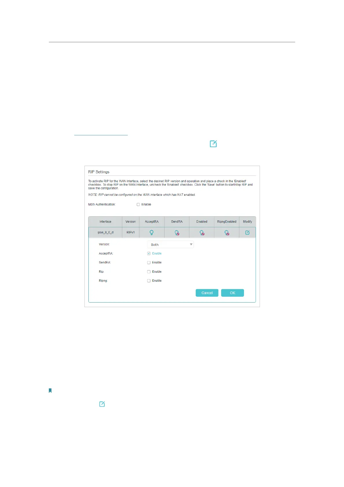 Ripng: Enable the RIP settings for IPv6. RIPng is designed for the exchange of routing