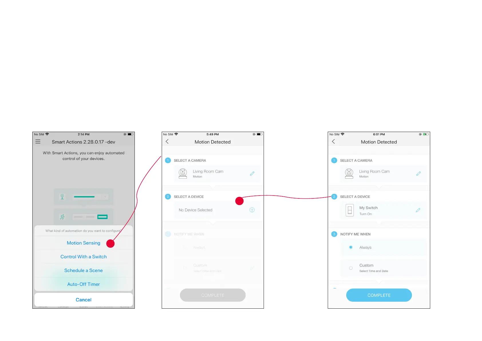 1. Tap Motion Sensing then select a camera. 2. Select your Smart Light Switch.