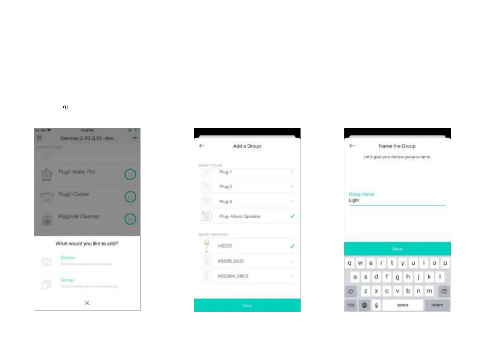 button in the app and select Group. 2. Select devices to be added in a group. 3. Name the group and tap Save. The Group