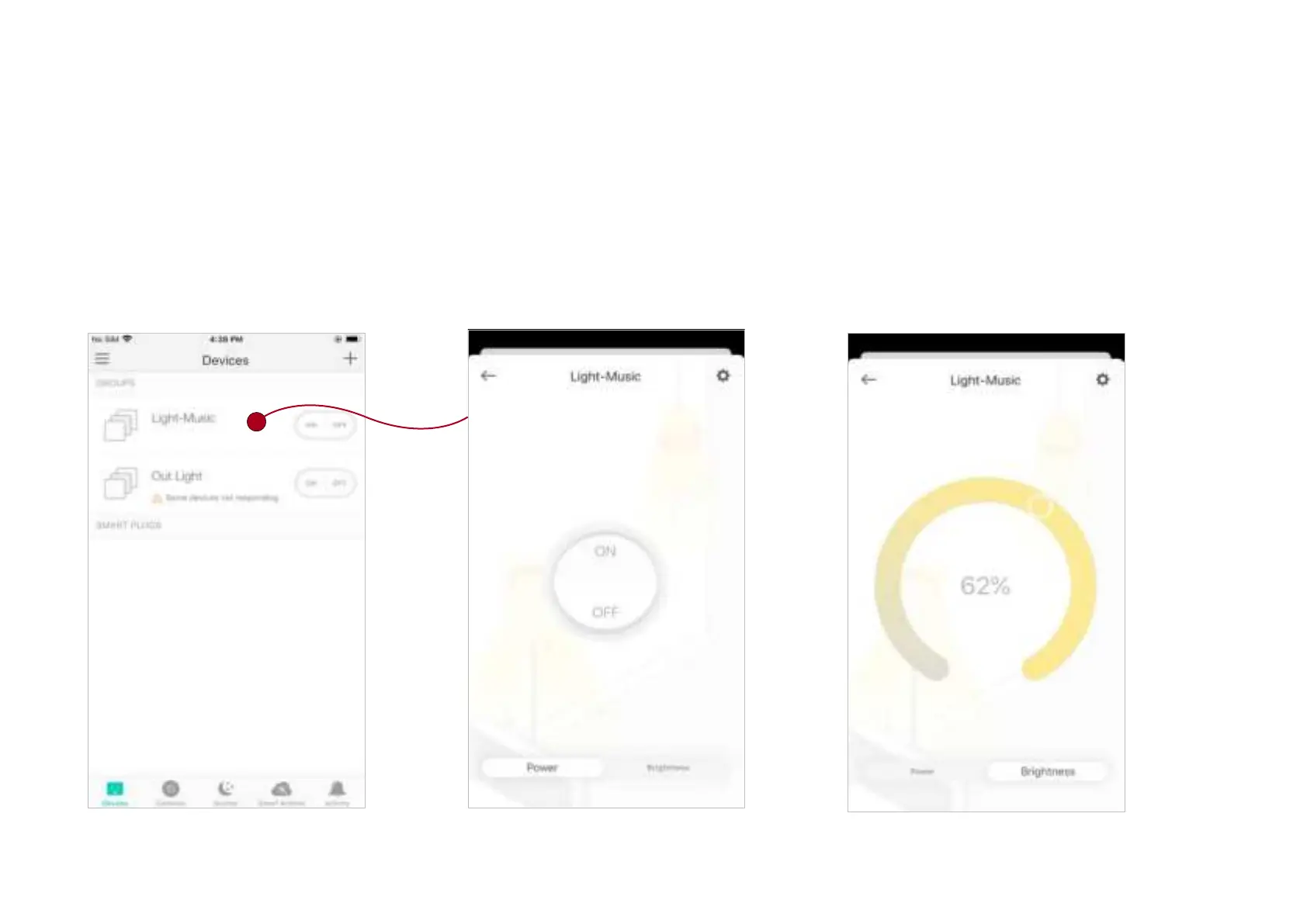 1.Tap your group in the Home page. 2. Turn on or o your group. 3. Set the brightness for your dimmer in the group.