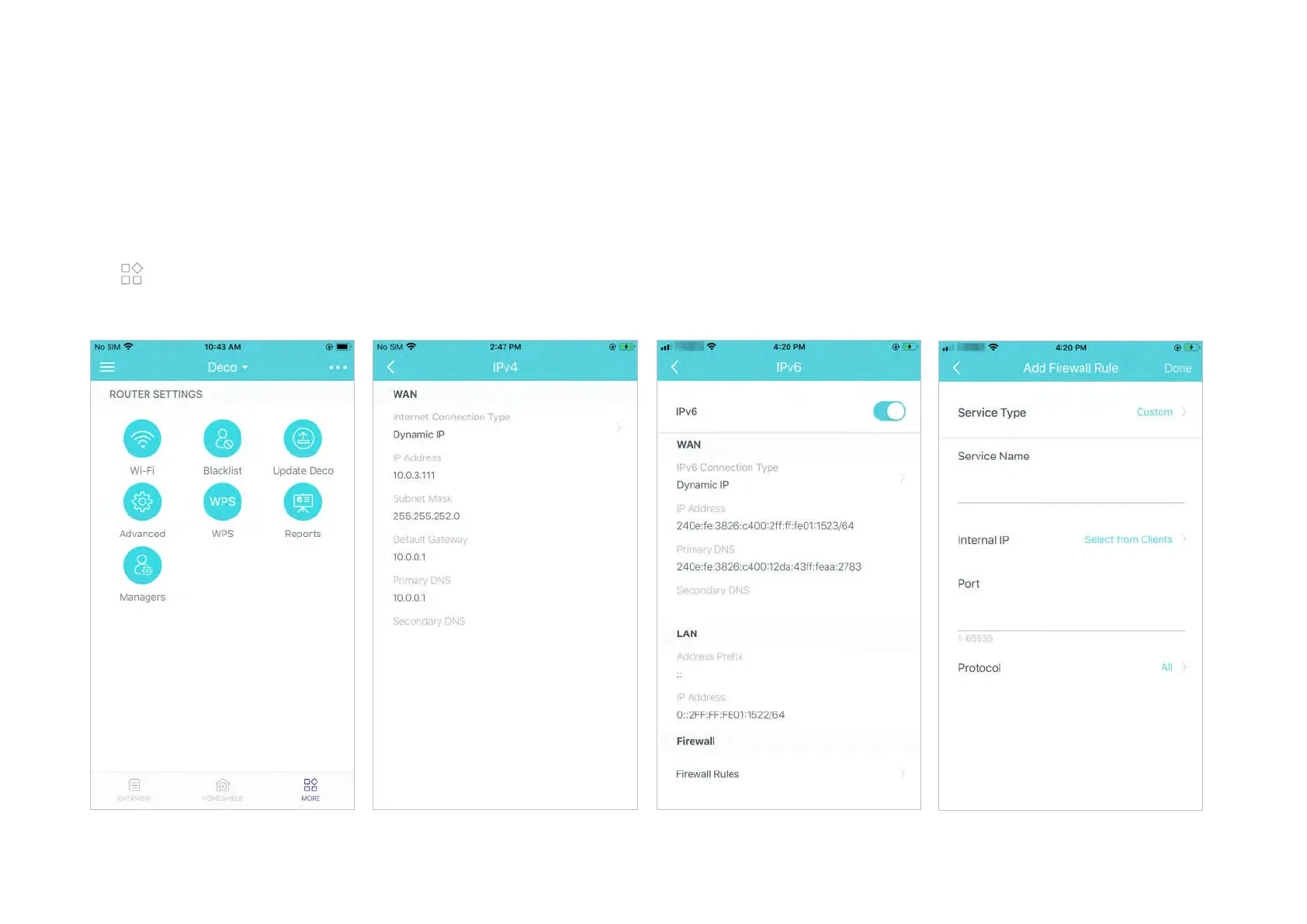 AdditionalfeaturesareavailableundertheAdvancedmenu.YoucanmodifyWANsettings(IPv4&IPv6),addIPv6rewallrules,modifyLANIP,setup