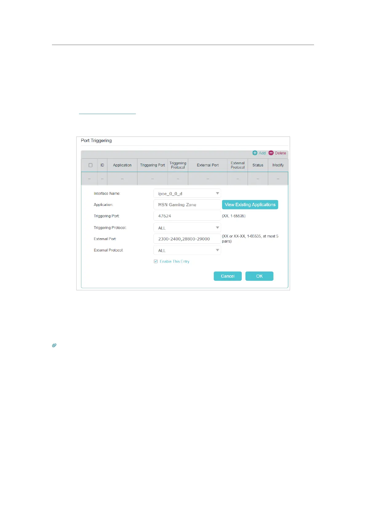 Advanced > NAT Forwarding > Port Triggering, and click Add.