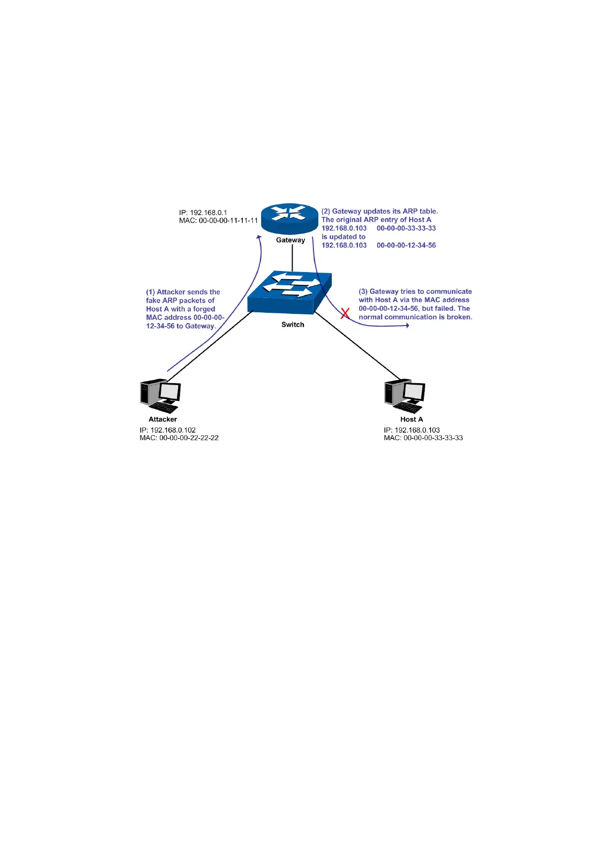 The attacker sends the false IP address-to-MAC address mapping entries of terminal Host/Server