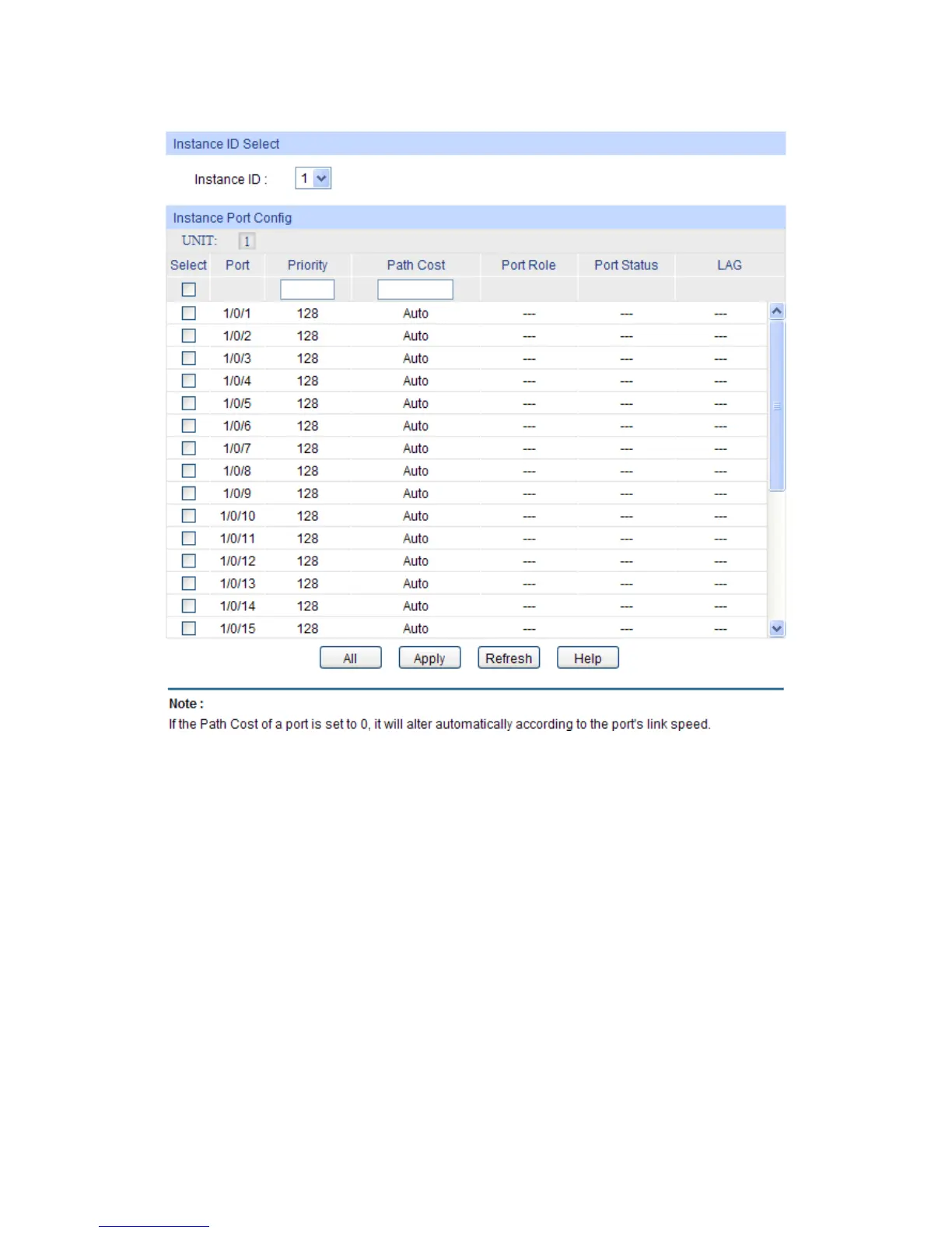 Choose the menu Spanning TreeMSTP Instance→Instance Port Config to load the following