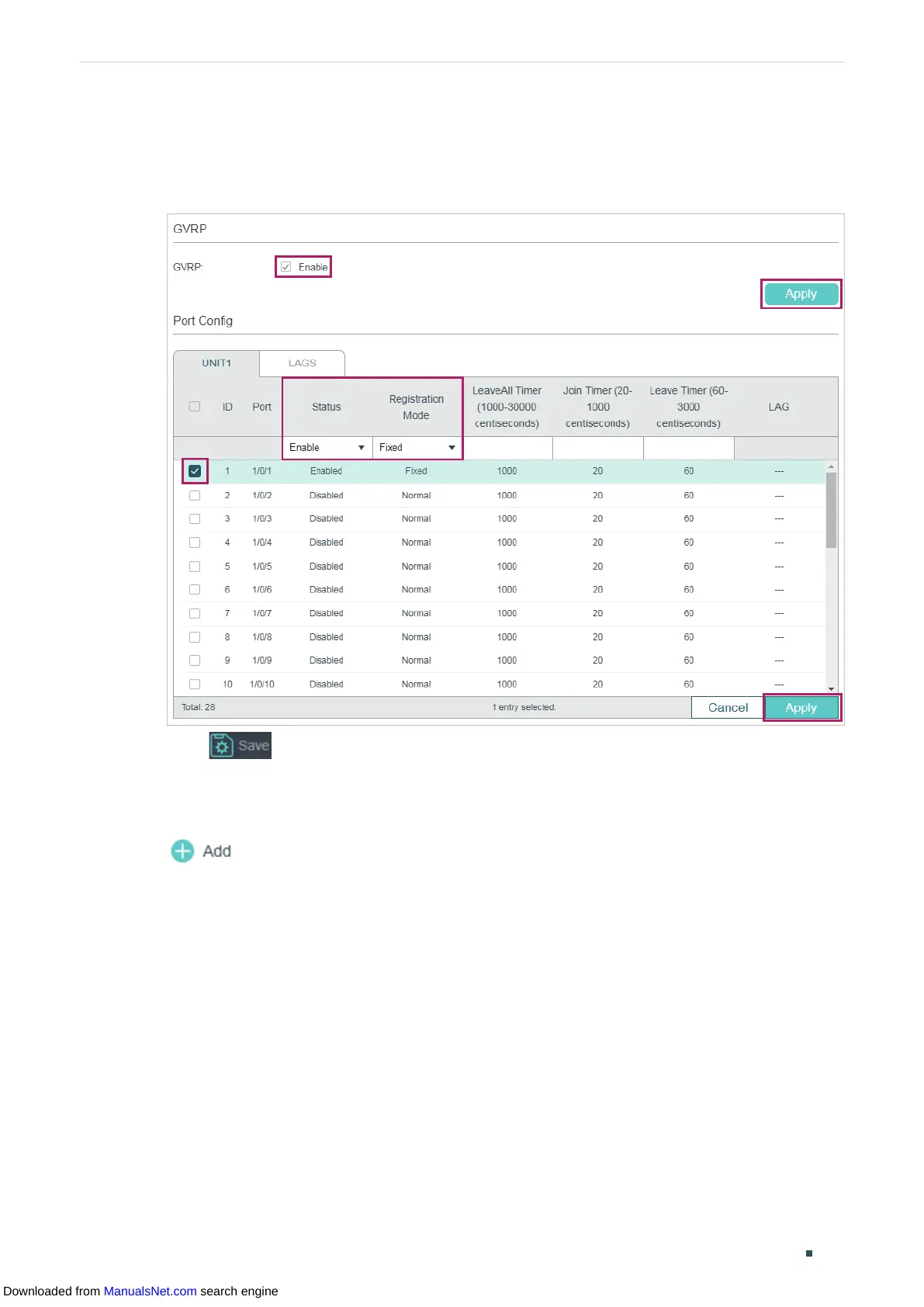 GVRP globally, then click Apply. Select port 1/0/1, set Status as Enable, and set