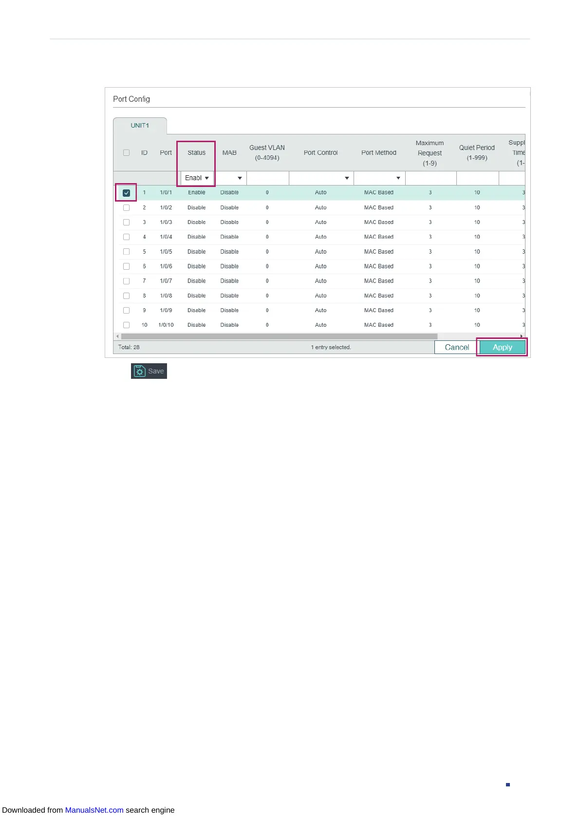3) Disable 802.1x authentication on port 1/0/2 and port 1/0/3. Enable 802.1x